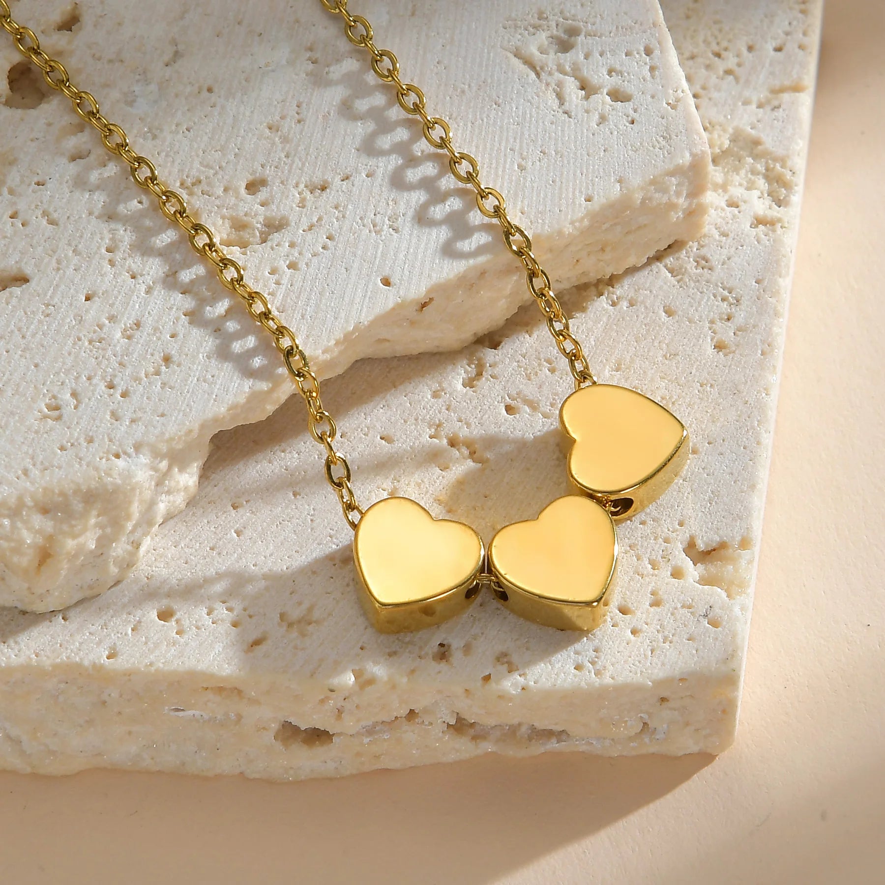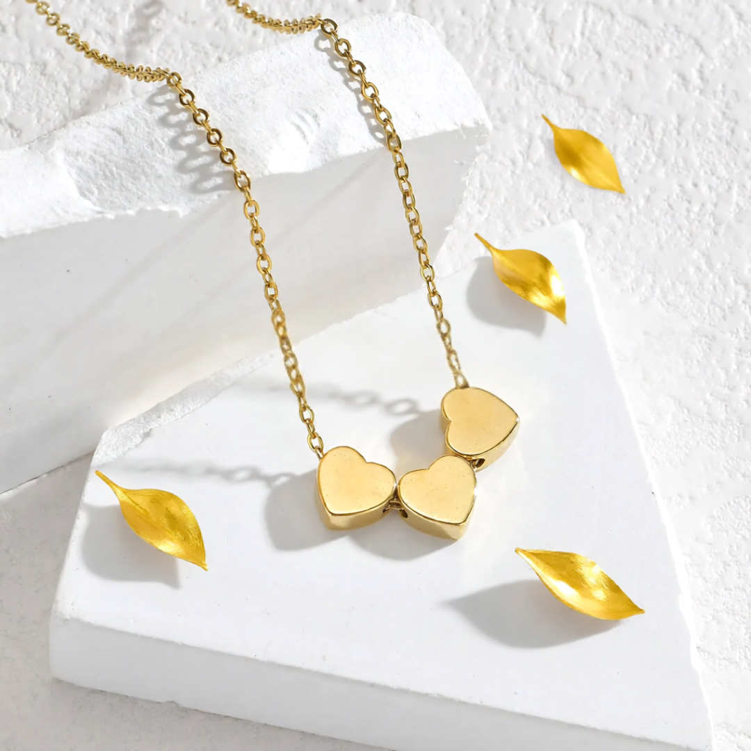 Elevate your everyday look with this stunning gold-plated necklace featuring three radiant hearts that are guaranteed to turn heads and make you shine.